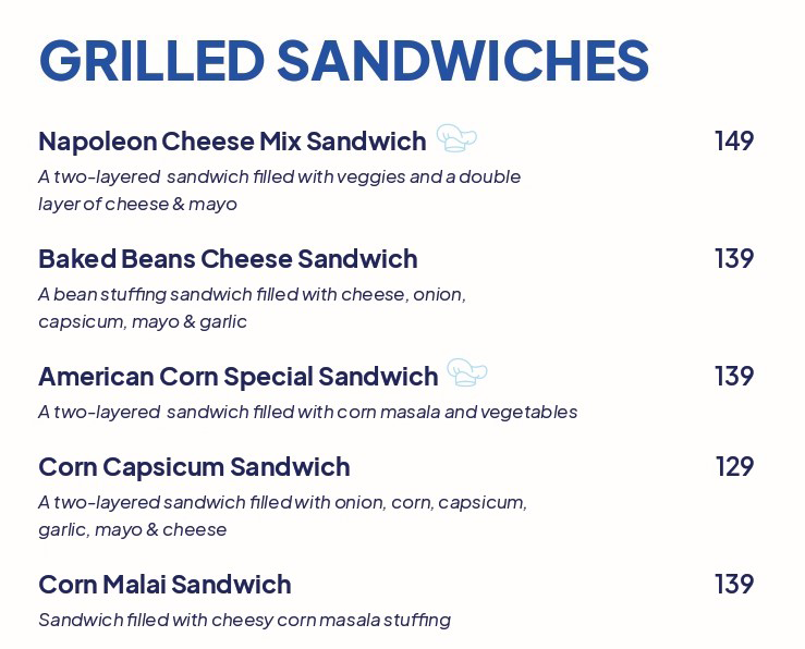- Sandwiches: Don't miss the Napoleon Cheese Mix Sandwich, beautifully grilled and served with crispy chips.